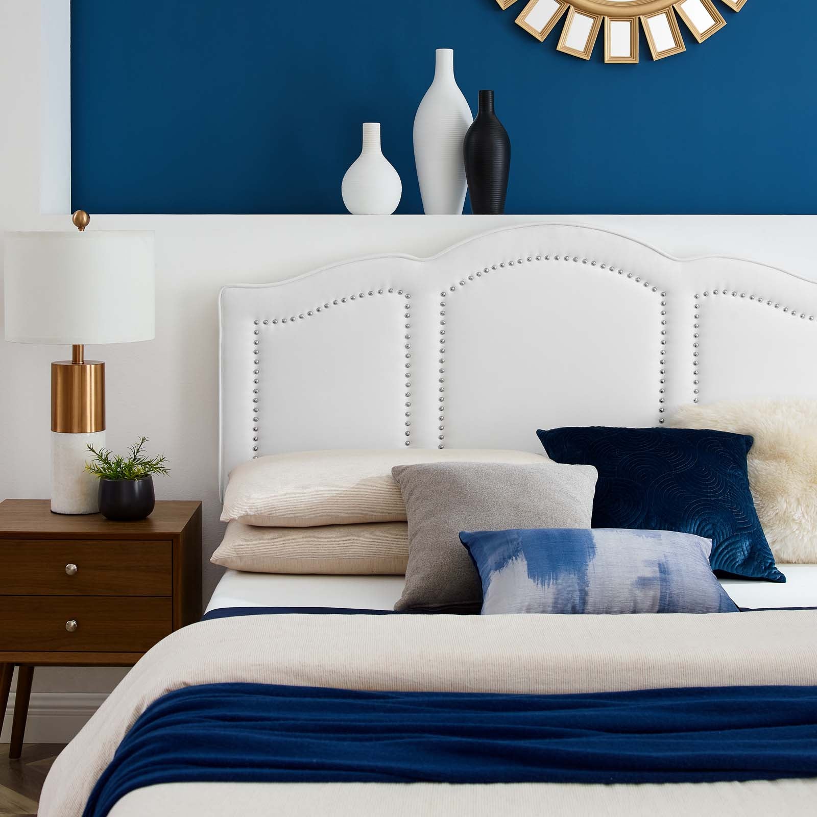 Reinvent bedroom surroundings with glam deco style and luxurious sleep with the Emerson Performance Velvet King Platform Bed. This king bed frame is complemented by the king headboard with an arched shape and nailhead detail. Resting atop wood legs with gold metal sleeves, this upholstered bed is covered in stain-resistant performance velvet with dense foam padding to offer comfort and support while sitting up in bed. This king size bed frame is a sturdy mattress foundation for memory foam, innerspring, latex, and hybrid mattresses. With supporting legs and a reinforced center beam, this upholstered bed is complete with a poplar wood slat support system that offers lasting stability. Mattress not included. Assembly required. Weight Capacity: 800 lbs.